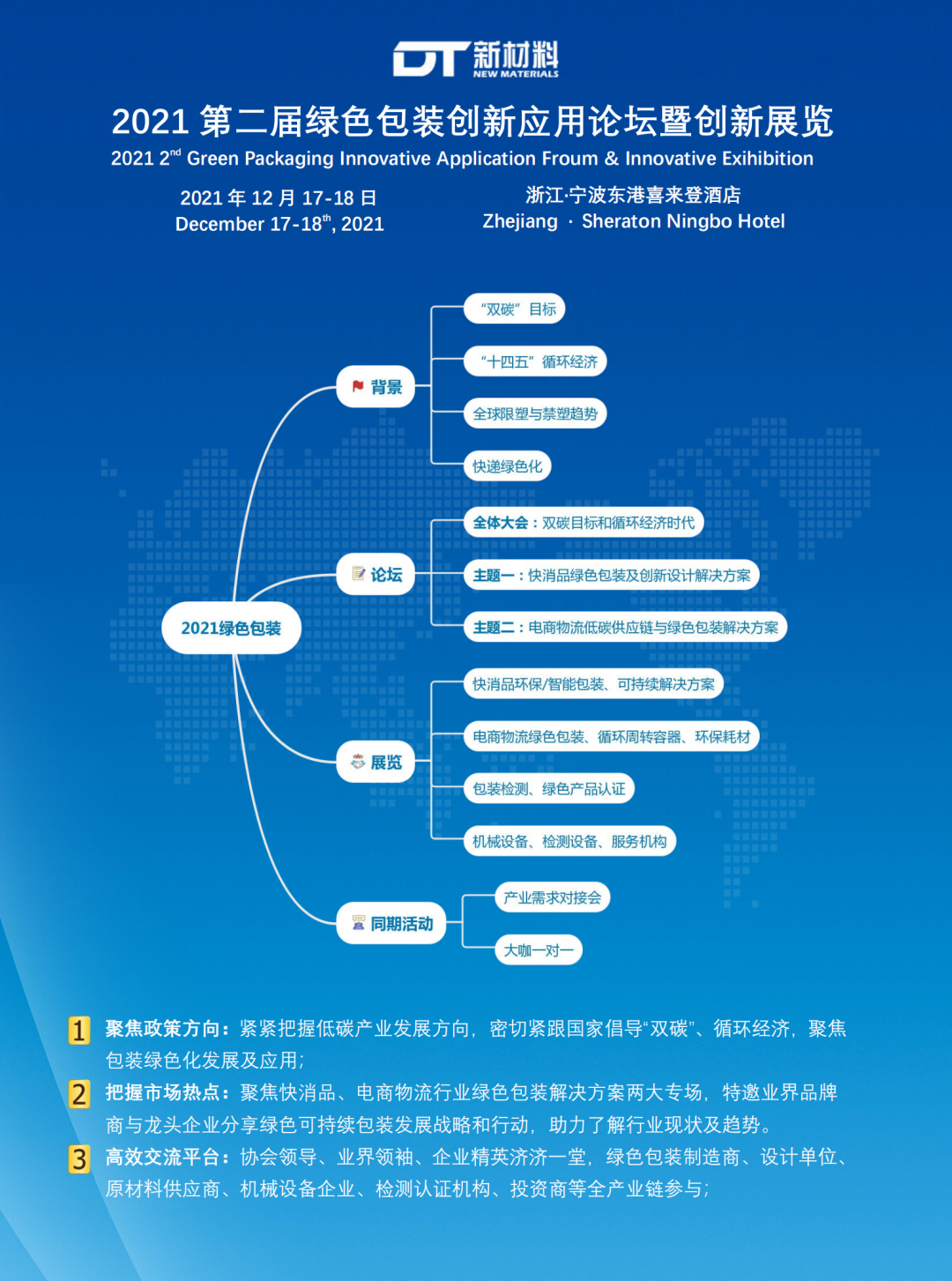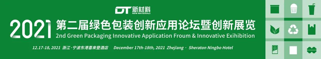 DT新材料将于12月17-18日在浙江·宁波东港喜来登酒店召开2021第二届绿色包装创新应用论坛暨创新展览,围绕快消品绿色包装及创新设计解决方案、电商物流低碳供应链与绿色包装解决方案两大主题,立足双碳、循环经济目标及终端企业可持续发展战略,聚焦绿色包装制品、低碳工艺、创新设计、循环利用等行业热点问题探讨,共促发展。